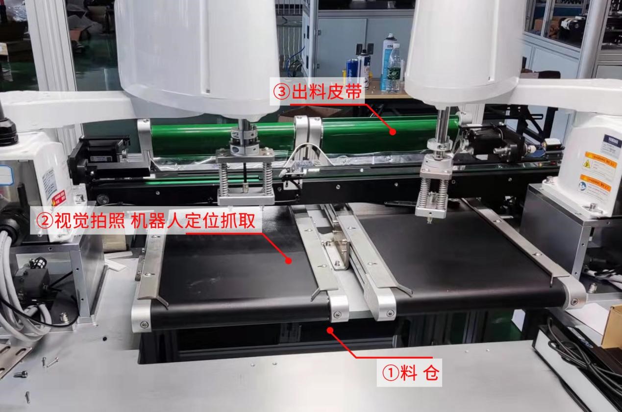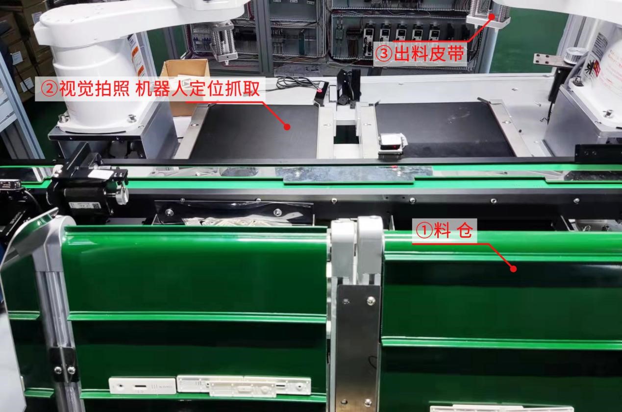 上盖机配备一台汇川H3U系列的PLC和一台7寸的触摸屏,主要控制步进电机给机器人进行供料。另外还配备两台4轴SCARA机器人和视觉系统,通过视觉拍照定位把盖子的坐标位置反馈给机器人让其进行取料操作。