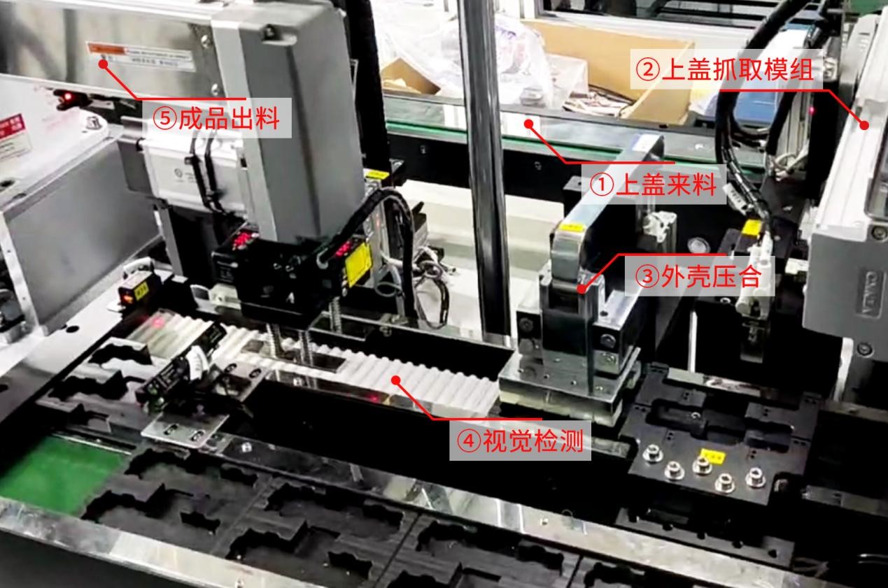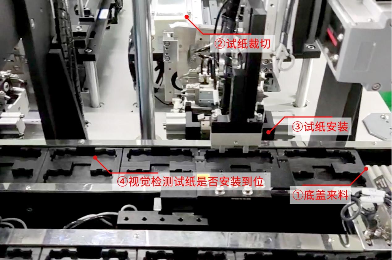 上盖机和底盖机负责给组装机供料,组装机安放好试剂条后把外壳进行压合组装,一个完整的抗原检测试剂卡就组装完毕。
