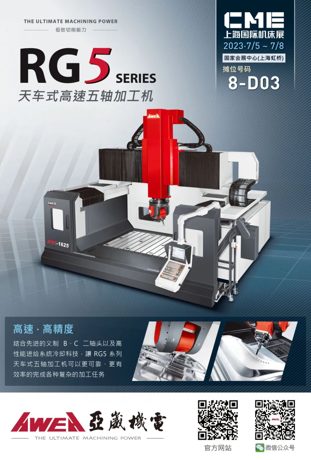 亚崴2023年CME上海国际机床展2023年CME上海国际机床展上海国家会展中心2023年7月5-8日参展机型RG5-1625天车式高速五轴加工机|高刚性天车式结构在相同的行程范围条件下,占地面积较定柱式机型减少40%。所有的轴向运动皆位于刀具端,轴向负荷小,动态精度更佳。370 人浏览