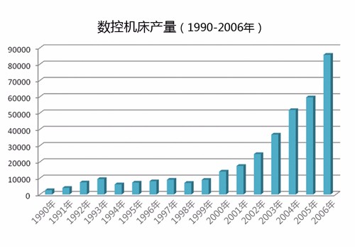作为机床工具工业发展的标志,“十五”(2001-2005年)以来,我国数控机床产量以30%以上的速度增长。五轴联动加工中心和五面体龙门加工中心等快速发展,进入实用阶段,为能源、汽车、航空航天等国家重点建设工程提供了关键设备。同时,为数控机床配套的功能部件、量刃具也得到了加速发展。单就金切机床而言,2002年全国产量达到23.10万台,其中数控机床24803台。到2003年,金切机床产量达到30.68万台,其中数控金切机床产量36813台。