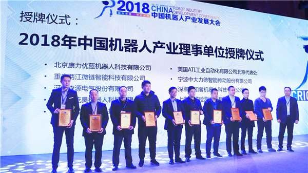 中国机器人产业联盟理事长曲道奎博士为2018年中国机器人产业理事单位授牌