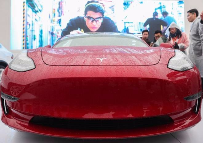 1月7日,人们在特斯拉上海超级工厂(一期)奠基仪式现场观看展出的Model 3车型。