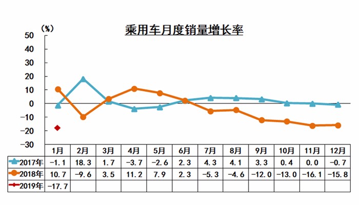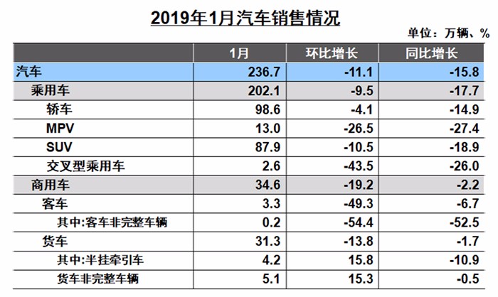 中国汽车工业协会统计信息显示,2019年1月,我国汽车产销比上月均呈下降,商用车降幅更为明显;与上年同期相比,汽车产销呈较快下降,乘用车降幅高于行业。