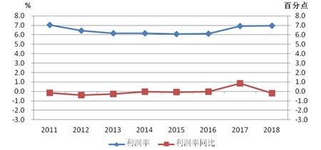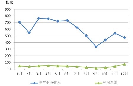 图9 2018年各月度行业主营业务收入、利润变化(国统局)