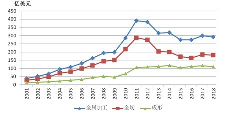 2018年金属加工机床消费额达291.3亿美元,同比微降2.8%。其中,金属切削机床消费额181.1亿美元,同比微降1.6%;金属成形机床消费额110.2亿美元,同比降低4.7%。2018年国内金属加工机床市场容量略有下降。2001-2018年国内金属加工机床消费额见图8。