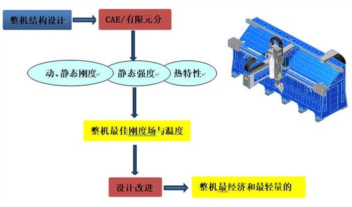 对整机结构进行CAE有限元分析,结合动、静态刚度,静态强度,热特性进行分析,得到整机最佳的刚度场与温度场,经过反复测试及验证,进行设计改进,分析理论值与实际测试值数据的差异化的因素,当理论值与实际测试值数据基本吻合,最终获得整机既经济又轻量的结构设计。机床结构优化设计及动态设计方框图与机床结构图如图2所示。