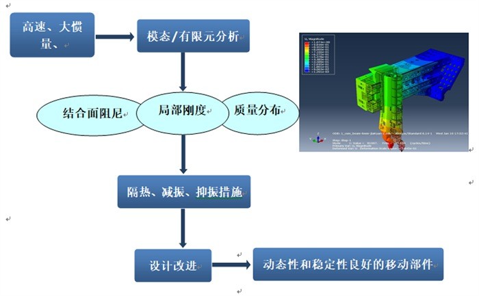 对高速度、大惯量、大尺寸的部件进行CAE有限元模态分析,对结合面阻尼、局部刚度、质量分布进行分析,采取隔振、减振、抑振措施,对结构进行设计改进及优化,经过反复测试验证,获取动态性能和稳定性良好的移动部件,确保产品的动态性能与稳定性。提高动态性能和稳定性方框图与模态分析图分别如图3 、图4所示。