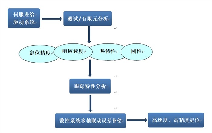 对电机及伺服进给驱动系统进行测试及有限元分析,结合定位精度、响应速度、热特性、电机刚性进行分析及优化,并跟踪特性分析,对数控系统多轴联动进行误差补偿,获得高速度,高精度定位。伺服驱动系统分析方框图如图5所示。