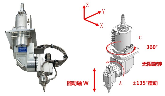 精密的光学计算,制定系统几何的空间算法,研制360?无线旋转三维切割头,自主创新,拥有核心技术,是继德国Trumpf、意大利Prima、德国LT后,第四家能够生产360?无线旋转三维切割头的厂家,打破了国外技术垄断。360?无线旋转三维五轴切割头如图6所示。