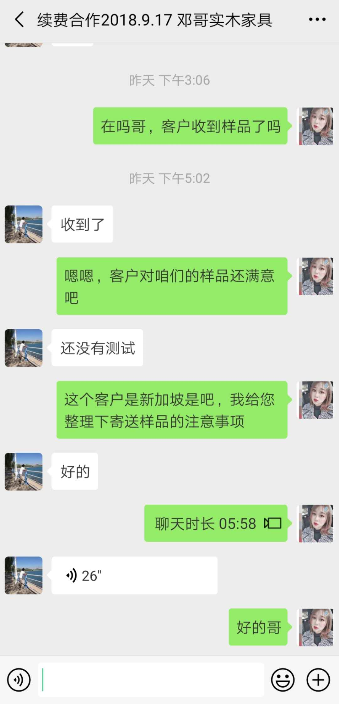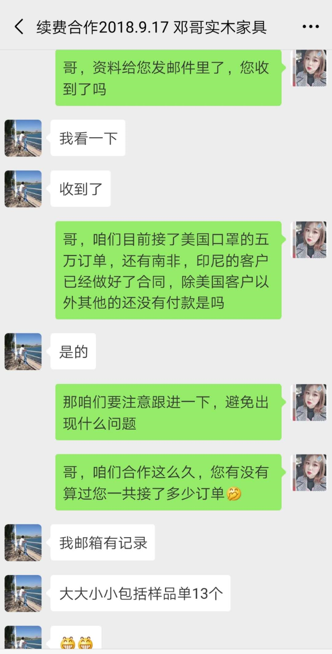 邓先生是在朋友的推荐下接触到的晟时科技,并在2018年与晟时科技达成合作,第一次做外贸,邓先生带着很多的迷茫和不确定。在晟时科技客服部李晓雨对客户回复的过程中,了解到邓先生的目前情况和困惑之后。开始对邓先生进行针对性的指导,如何利用渠道寻找客户,如何联系客户,如何跟进客户等。但万事开头难,对于毫无外贸经验的邓先生而言并非易事,接受指导后的半个月时间,还是没有询盘,没有成功开发客户,邓先生有些着急,然而再次联系客服李晓雨抱怨,吐槽,并开始质疑公司团队效果等等。客服李晓雨不厌其烦,耐心的帮邓先生去分析和寻找原因,并把其他客户的成功经验分享给邓先生。合作半月之内接到订单的山东客户梁先生,是如何去做的,第一步如何,第二步如何等等,一个月之内成功接单的李先生,又是如何如何。正是因为客服的这份耐心与热情让邓先生倍受感动。