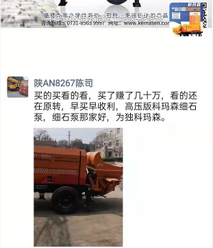 湖南科玛森机械制造有限公司的技术研发人员致力于混凝土细石泵的研发与生产已经20年,20年来一直以来更好的服务客户为己任,用最诚信的价格为客户带来最高品质的产品,科玛森人始终坚信诚信乃优秀企业的安身立命之本。所幸,多年来的坚持科玛森也得到了广大客户的肯定与支持。