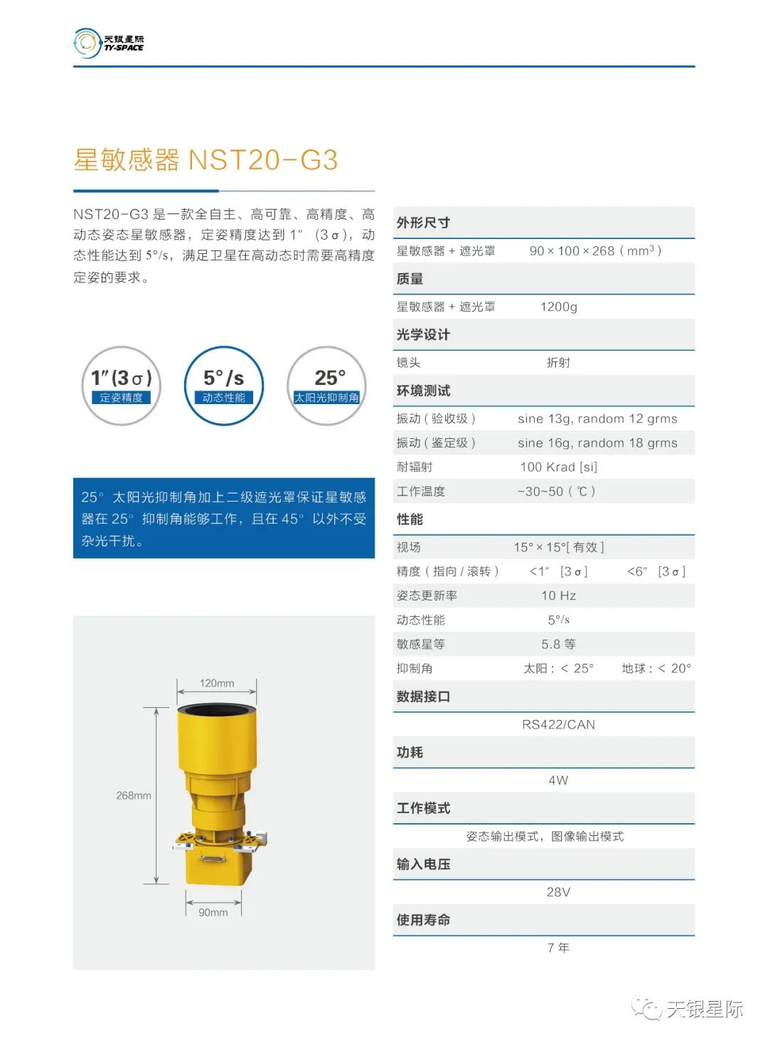 NST20-G3星敏是一款高精度星敏感器,定姿精度为 1″ [3σ],且动态性能可达5?/s,满足了卫星在高动态时需要高精度定姿的要求。