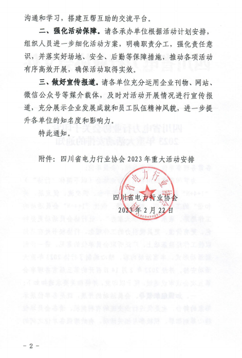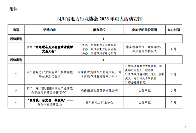 2月22日,四川省电力行业协会(简称“行协”)印发2023年工作计划和重大活动安排。2023年,行协将全面贯彻落实党的二十大报告中提出的调整能源结构、加快规划建设新能源体系,确保能源安全等要求,全面发挥好协会平台、桥梁、纽带、主体等功能,着力开展10项以上重要活动。