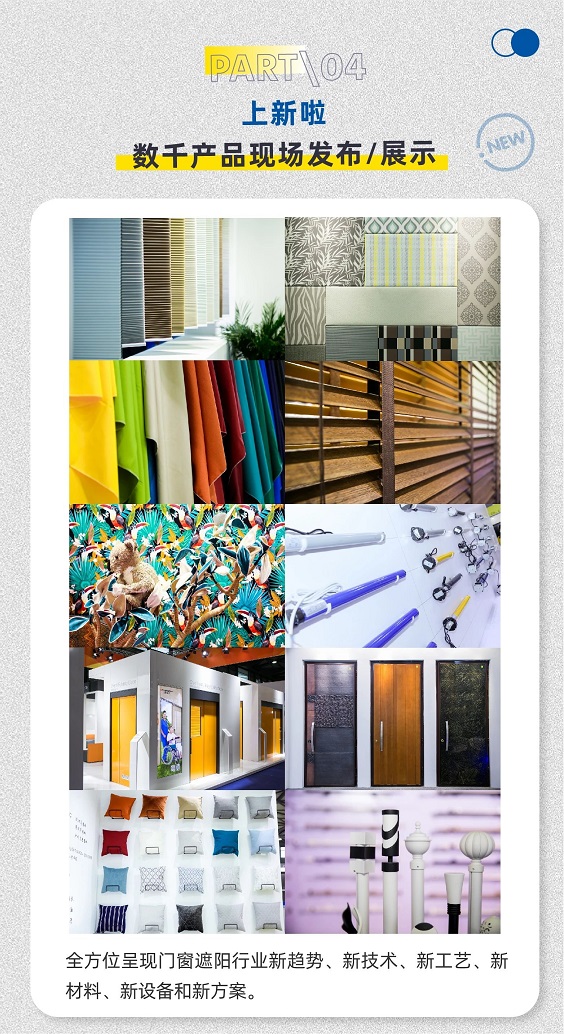 今年,众多国际品牌纷纷强势回归,国内知名企业和新星品牌也将逐一亮相。覆盖遮阳面料、配件、驱动及控制系统、外遮阳、机械、窗饰成品、百叶窗透气窗等建筑遮阳细分领域以及工业门、自动门、车库门、入户门、门机门控等门及门禁上下游产业链,实现门窗遮阳全产业链跨界共融,资源共享。