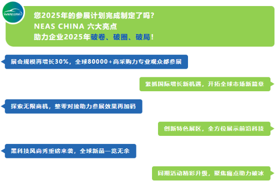 在上届展会现场,不少观众及参展商都问及下届展会的招展情况——NEAS CHINA 2025将继续为参展企业量身定制,提供一个从线下展览到线上媒体全方位多维宣传,建立商业联系和发现新商机的专业平台,促进行业间的创新合作和商机发掘,助力品牌启航。