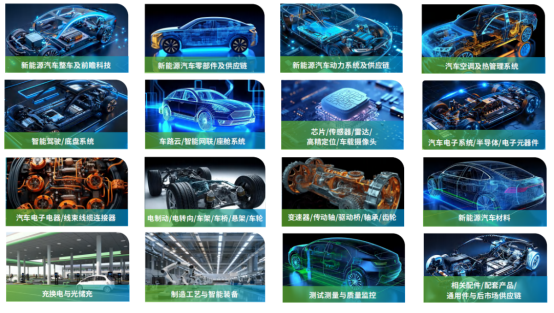 本届展会整合行业资源,以强大阵容展示前沿技术成果、首发新品、新材料及最新解决方案,展品涵盖新能源汽车整车、飞行汽车、综合零部件、动力总成、动力电池、电驱动系统、智能网联、高级别智能驾驶、智能底盘、智能座舱、汽车芯片、汽车电子系统、能源供给、汽车空调与热管理系统、线缆/线束/连接器、内外饰系统、车身系统、汽车新材料及应用材料、检测/测试测量/质量监控、加工设备与智能装备、智慧工厂、相关部件、标准件及配件等领域的创新产品和技术成果,链接上中下游优质产业链,发挥联展品牌和底蕴优势。