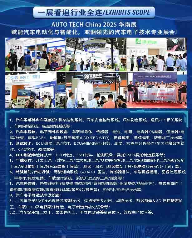 AUTO TECH China 2025 广州国际汽车电子技术展览会是一个促进行业交流、推动技术进步和拓展市场的重要平台。在这里,我们可以和汽车行业领袖交流汽车电子技术的最新成果,探索行业的未来发展趋势,共同谱写汽车电子行业的新篇章。2025年11月20日-22日,广州保利世贸博览馆,期待您的莅临!更多精彩等待您现场解锁!详情请登录:www.china-autotech.com参展联系人:黄先生133 3289 9255jasonhuang@jswatsonexpo.com/ 参观联系人:汪女士177 2452 1438 wangcuiping@jswatson-expo.com