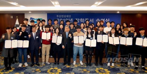 • 斗山集团向128名大学生颁发8.6亿韩元奖学金斗山莲岗财团(董事长朴容昡)于26日发布消息说,25日下午在首尔中区天空花园酒店(HOTELSKYPARK)东大门举办2019年斗山莲岗财团奖学证书颁发仪式,向128名大学生共颁发了8.6亿韩元奖学金2019-03-22