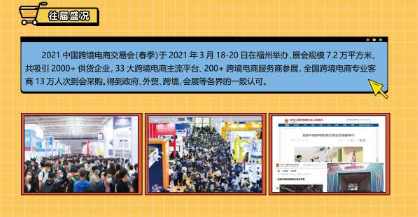 首届中国跨境电商交易会于2021年3月18-20日在福州举办,展会规模7.2万平方米,共吸引2000 供货企业,33大跨境电商主流平台、200 跨境电商服务商参展,全国跨境电商专业客商13万人次到会采购。得到政府、外贸、跨境、会展等各界的一致认可。