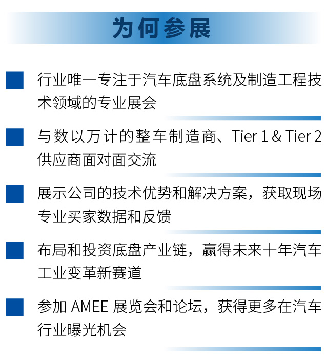 上海国际汽车底盘系统与制造工程技术展览会(简称:AMEE)创办于2018年,是全球汽车底盘工程技术领域的旗帜展览会,AMEE为中国汽车底盘技术创新与持续发展搭建了高质量平台,促进全球汽车制造商综合竞争力的提升,AMEE已成为汽车底盘研发、技术、工艺、采购、质量和管理人员每年必参加的重要活动之一。
