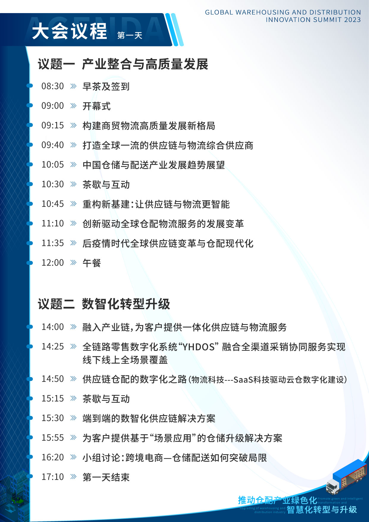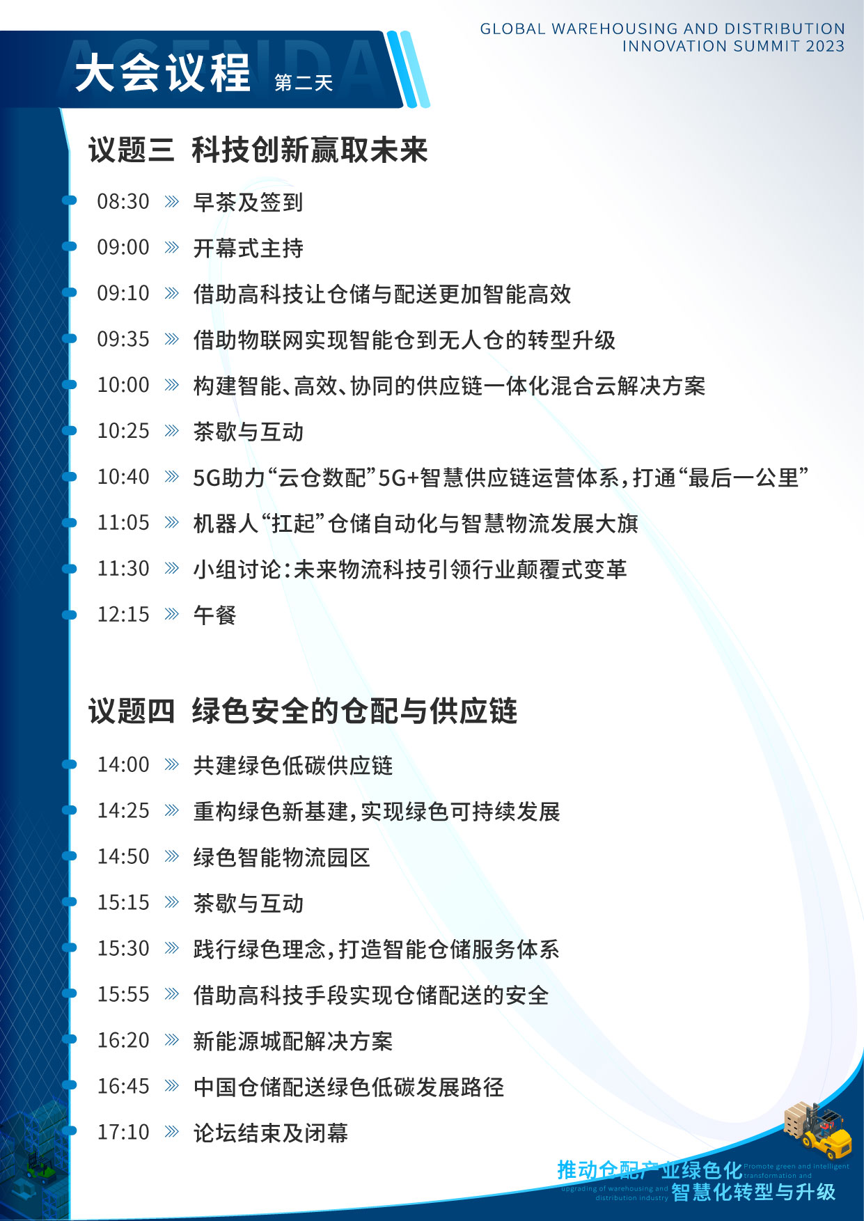 本次峰会以“推动仓配产业绿色化、智慧化转型与升级”为主旨,力争为促进政策法规落地、优化产业链结构、深化内部创新与外部合作的支持型机构和行业头部企业提供一个专业的合作交流平台。为期2天的大会,包含“17 5”个中外主题演讲与2个小组讨论,以最关键、最深入的话题为导向,带您走进仓储与配送行业领袖的视角,感受一场精彩绝伦的思想盛会。