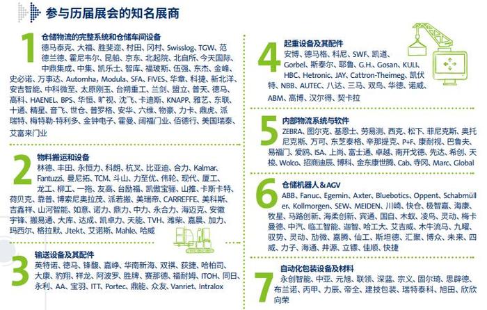 5、内部物流系统与软件:ZEBRA,图尔克、东芝泰格、P F,康耐视、巴鲁夫、易福门、爱欧,ISA,上尚,富士通,卓越,南开戈德,先达,希创,天梭,Wolco,招商迪辰,博科等。