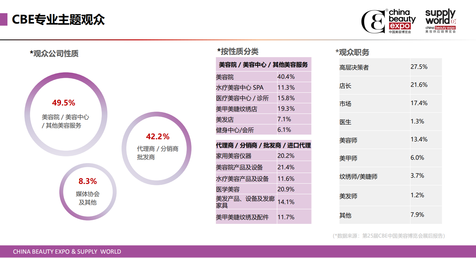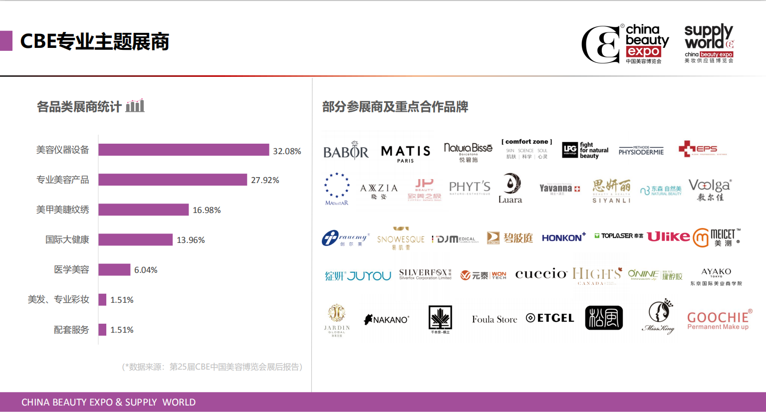 作为中国美容博览会(上海CBE)专业美容展(Professional Beauty)的领衔品类,汇聚了来自20多个国家的近200个专业美容产品品牌,为参展商和专业买家提供了一个优质的贸易平台,展示风靡全球院线的产品及项目。