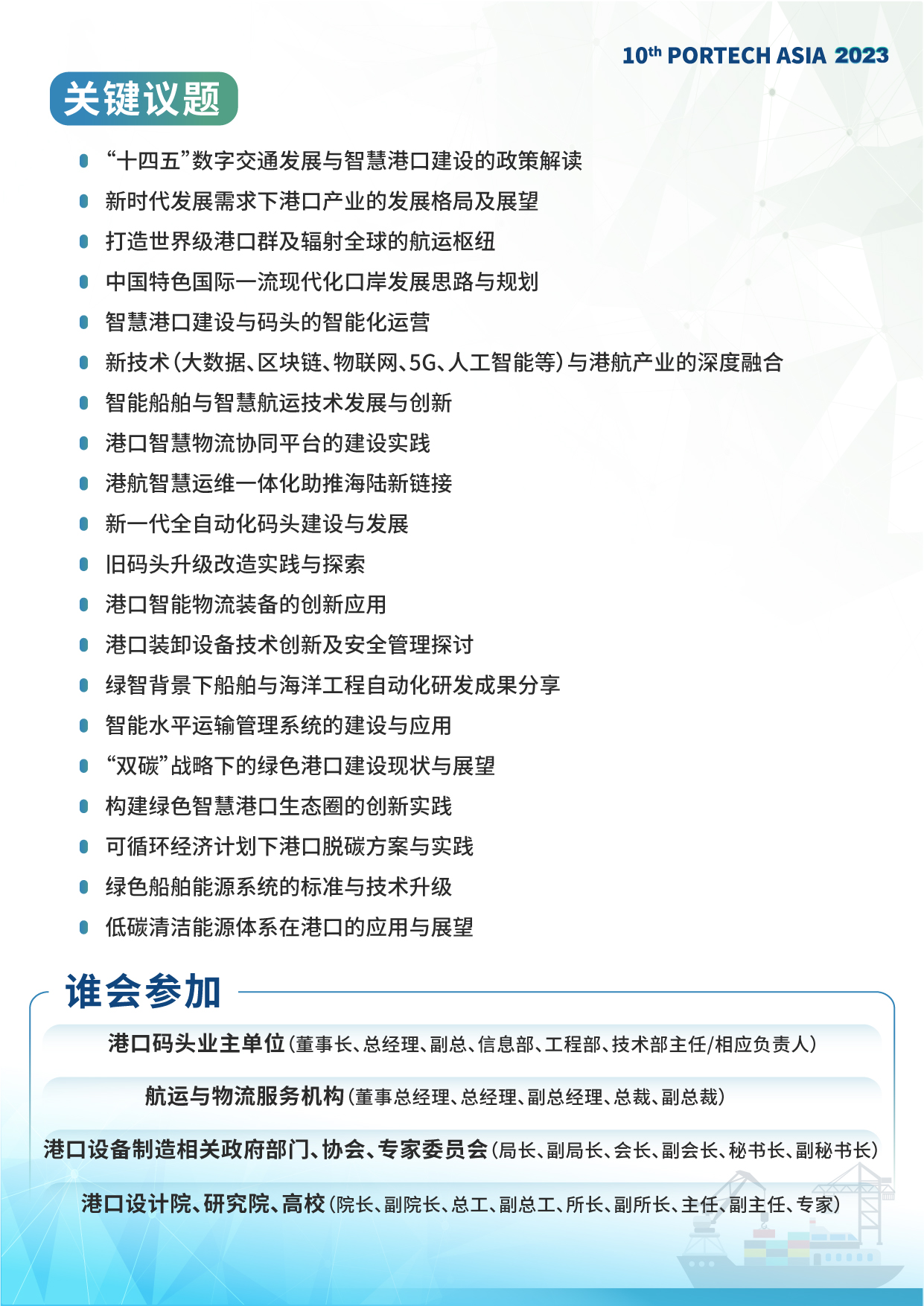 基于此,2023(第十届)亚太港口科技峰会将以“融合创新 绿智转型”为主题,围绕港口科技融合创新、自动化升级、数字化转型与可持续发展等主要内容,邀请港口协会、地方交通运输管理部门、国内外港口码头业主、港口设备制造商、高科技解决方案供应商等领域的领袖专家,共同探讨港口科技创新成果和机遇挑战,推动引领世界一流的智慧港口、绿色港口建设!