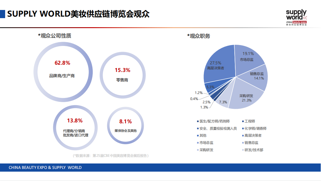 Supply World美妆供应展简介:美妆供应链博览会 (下简称Supply World)由中国国际贸易促进委员会轻工分会与英富曼集团上海百文会展有限公司共同主办。是中国美容博览会 (下简称CBE) 供应链主题展的升级之作。自2024年起以供应形象全新启航,并将如期于2024年与第28届中国美容博览会共同举办。借助CBE品牌的国际影响力,Supply World将第一时间链接和识别化妆品OEM/ODM/OBM,包装,机械设备,原料,材料等5大品类,36个细分品类产品的全球趋势及热点,为全球美妆产业的提升,展示技术、配套齐全、设计时尚的产业供应链生态。