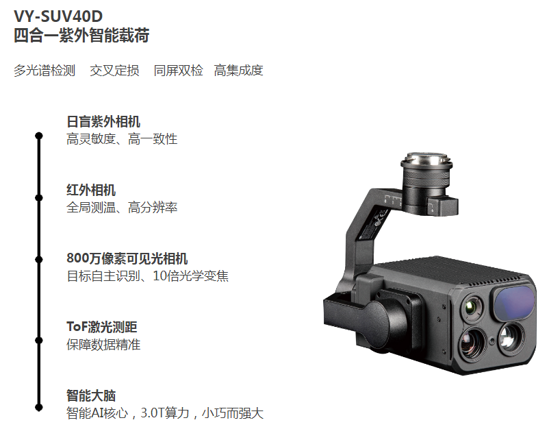 VY-SUV40D四合一紫外智能载荷,搭载高灵敏度紫外相机与全局测温红外相机,可对目标进行局放和温度的同步检测。局放检测具有光子计数值一致性,温度检测支持自动缺陷分析。