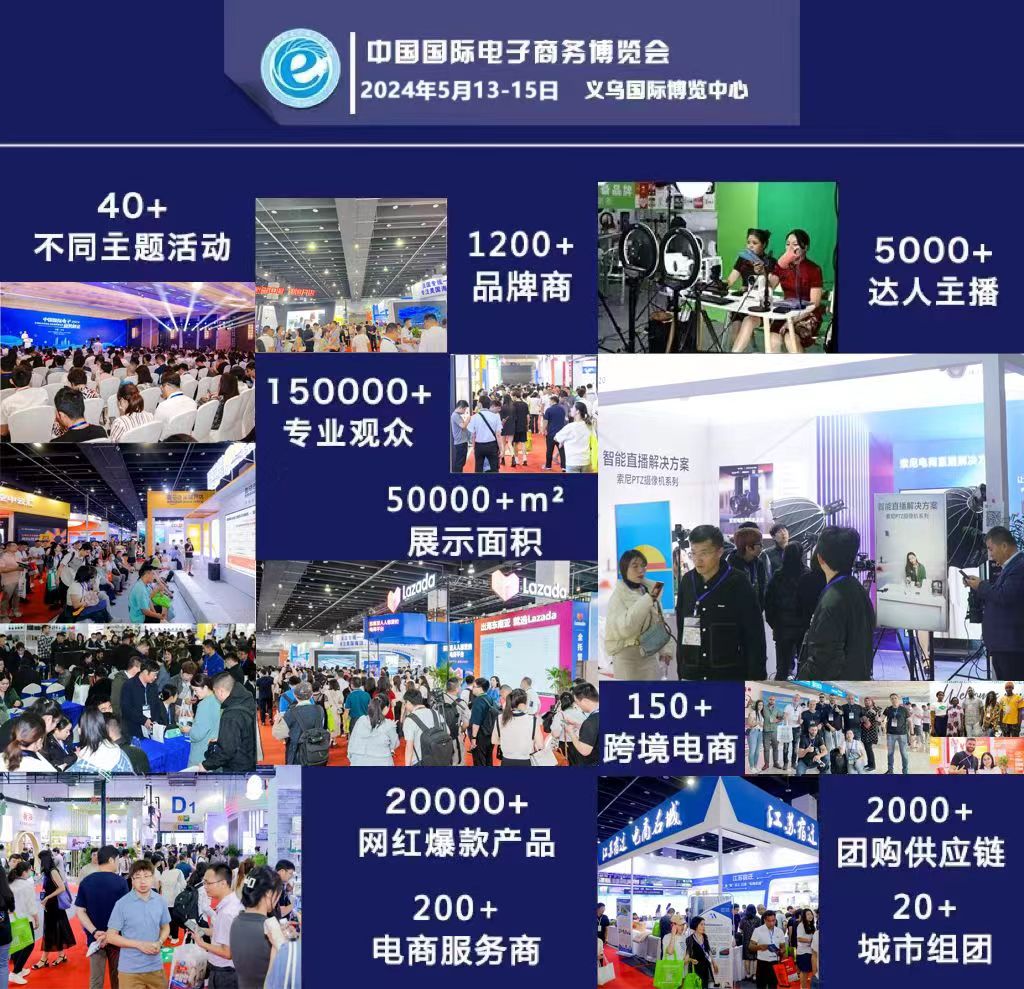 2024中国国际电子商务博览会以"构建新发展格局 发展高质量电商”为主题,将于5月13-15日在义乌国际博览中心举行,预设国际标准展位2200个,展览面积超50000平方米,包括数字商务展区、知名电商平台展区、跨境电商展区、电子商务示范城市/示范基地/跨境电商综试区展区、电子商务服务企业展区、直播电商展区、农村电商展区、品牌供应链8大展区。集中展示国内外最新的电子商务研发应用成果和全产业链服务。博览会同期还将举办2024中国国际电子商务峰会、2024世界数字贸易大会等活动。