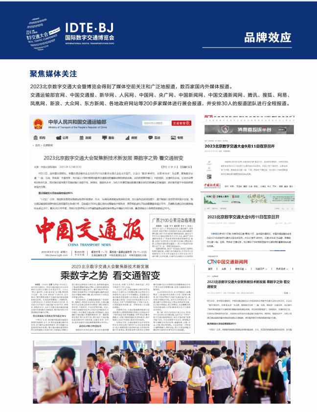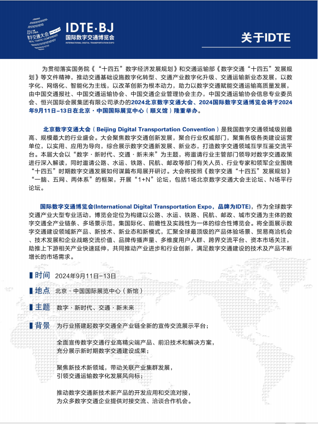 国际数字交通博览会(International Digital Transportation Expo,品牌为IDTE),作为全球数字交通产业大型专业活动。博览会定位为构建以公路、水运、铁路、民航、邮政、城市交通为主体的数字交通全产业链条、多场景示范,集国际化、前瞻性及实践性为一体的综合性博览会。将全面展示数字交通建设领域新产品、新技术、新业态和新模式,汇聚全球最顶级的产品体验场景、贸易商洽机会、技术发展和企业战略交流价值、品牌传播声量、多维度用户人群、跨界交流平台、资本市场关注,助推上下游相关产业快速延伸,共同推动产业进步和行业创新,满足数字交通建设的技术及产品不断增长的市场需求。