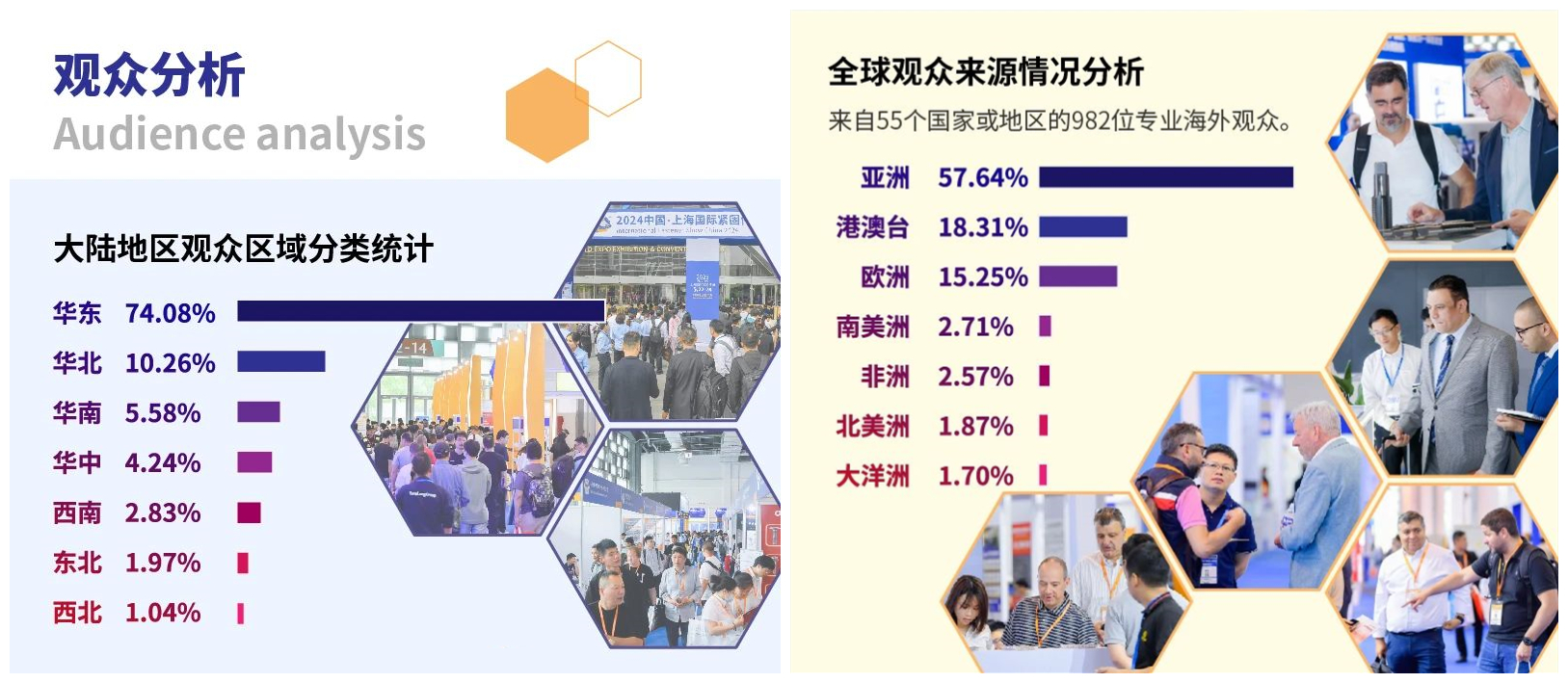 海外观众来源情况分析:来自55个国家或地区的982位专业海外观众,其中北美洲占比1.87%,大洋洲占比1.70%,非洲占比2.57%,南美洲占比2.71%,欧洲占比15.25%,亚洲占比57.64%,港澳台占比18.31%。