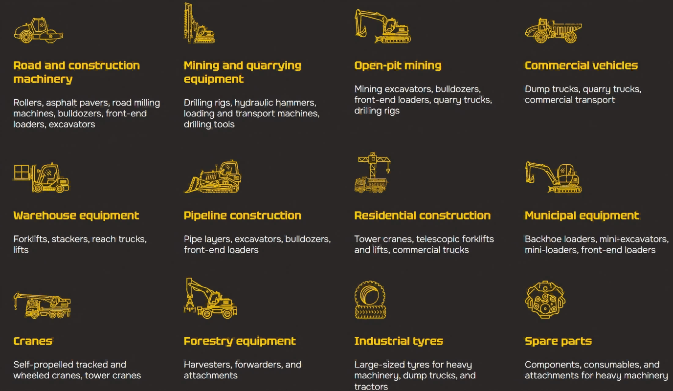 展品范围丰富多样,从道路施工设备的压路机、沥青摊铺机,到起重机的各类机型;从管道施工的吊管机、挖掘机,到矿山设备的钻机、装载运输机;从房屋建造的塔式起重机,到市政工程的小型挖掘机;从卡车货车,到仓储设备的叉车、堆垛机;从工业轮胎,到重型设备的各类配件,应有尽有,全面覆盖工程机械、矿业机械及特种装备领域。