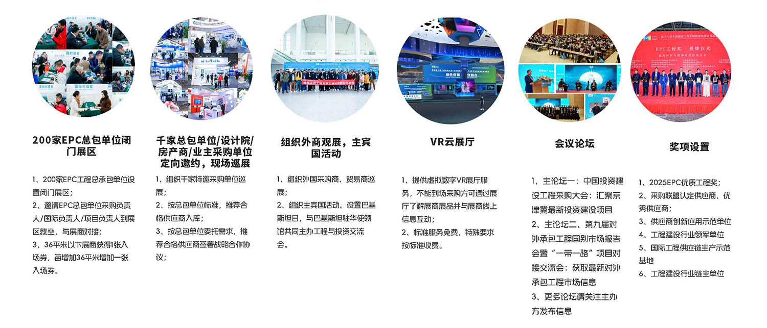 EPC博览会历经7年沉淀,专注于为工程总包单位提供从项目立项、设计咨询、投资建设、施工采购、项目管理、交付运营全过程的整体服务方案;从工程建设各阶段单项创新技术产品到系统集成,优化产业链结构形成闭环。积累了10多万专业观众数据,包括工程建设单位、EPC总包单位、设计院、设计师、房产商等专业观众资源,致力于打造以围绕工程总承包单位为核心,贯通工程上下游产业链企业的专业展览展示平台。